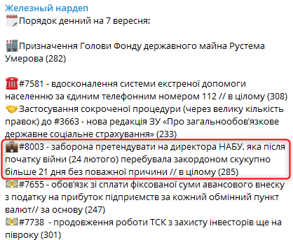 Теперь на пост директора НАБУ не может претендовать тот, кто после начала вторжения РФ 24 февраля находился за границей совокупно больше 21 дня без уважительной причины.