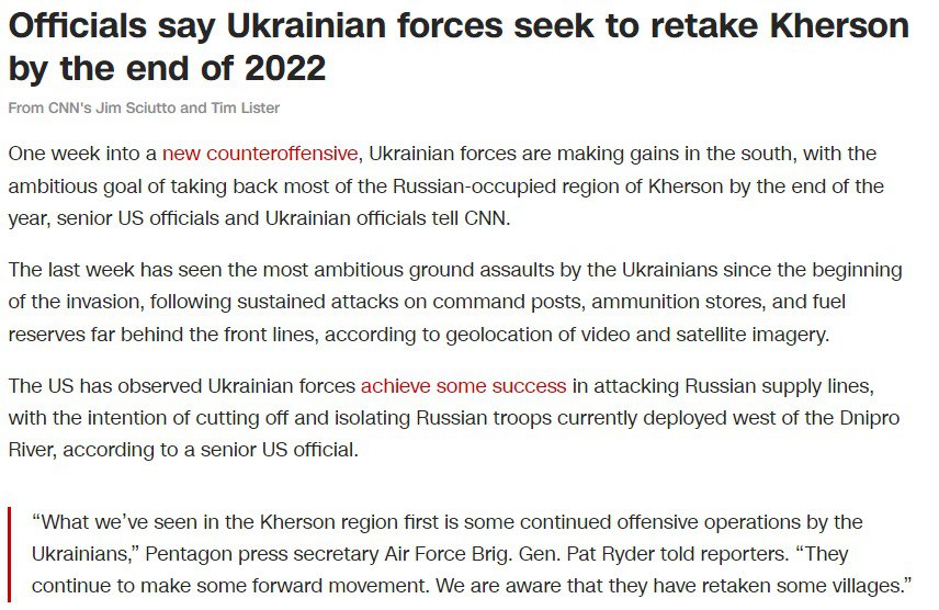 По словам высокопоставленного американского чиновника, США наблюдают, как украинские силы добились определенного успеха в нападении на российские линии снабжения с намерением отрезать и изолировать российские войска, дислоцированные в настоящее время на юге к западу от Днепра.