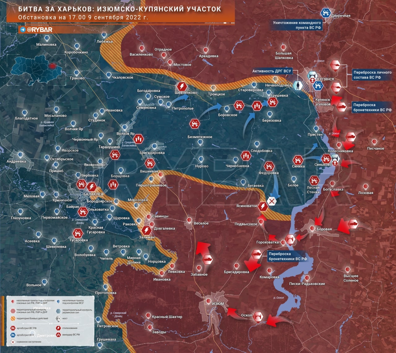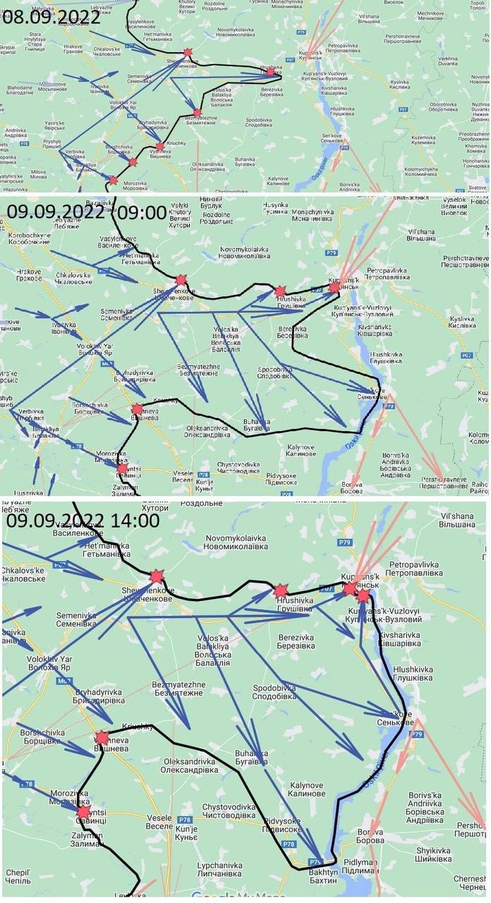 Отдельные российские телеграм-каналы пишут, что идут контратаки россиян в районах сел Синиха-Сеньково-Воронцовка-Федоровка-Лесная Стенка. Также пишут о наступлении ВСУ на Гороховатку, где расположен ближайший к Изюму мост через Оскол (пишут, что был контрудар РФ с восточного берега из Боровой).