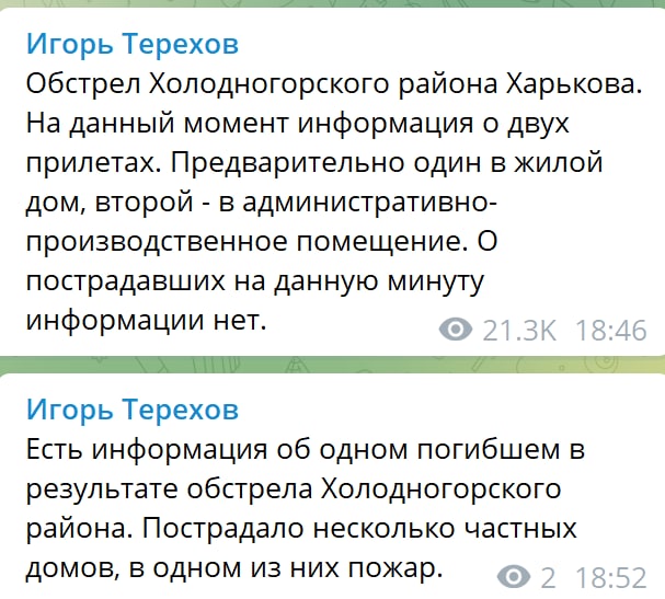 19:29 Снова прилет в Холодногорском районе Харькова. Попадание в частный дом, там начался пожар.