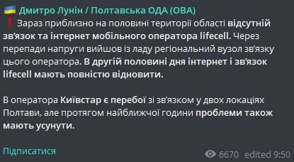 10:00 На половине территорий Полтавской области отсутствует связь и интернет lifecell.