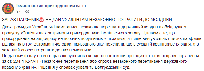 "Интересно то, что пограничный наряд сразу не увидел нарушителей в лесополосе, а лишь почувствовал запах стойких духов от веяния ветра. Задержанные мужчины призывного возраста объяснили, что в соседней стране живет их родня, а законным способом попасть в нее невозможно", - говорится в сообщении.