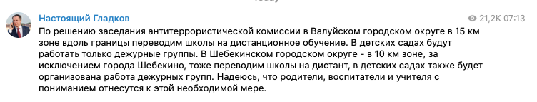 В Белгородской области РФ решили перевести на дистанционное обучение школы, находящиеся недалеко от границы с Украиной. А в детских садах будут работать только дежурные группы.