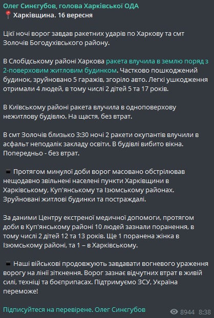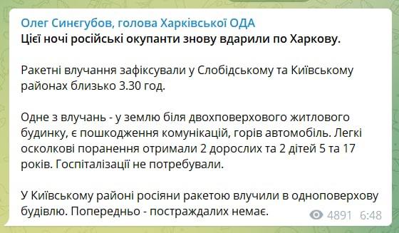08:10 Ночью войска РФ нанесли удар по двум районам Харькова. В результате пострадали четыре человека, сообщил глава Харьковской ОВА Олег Синегубов.