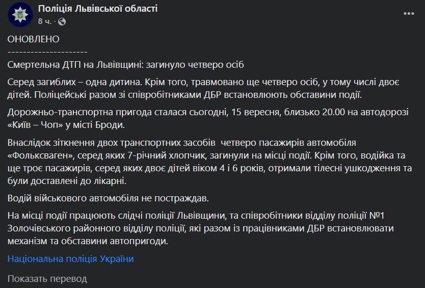 08:15 Вчера вечером во Львовской области произошло ДТП с участием военного автомобиля. В результате погибли четыре человека. Водитель военного авто не пострадал.