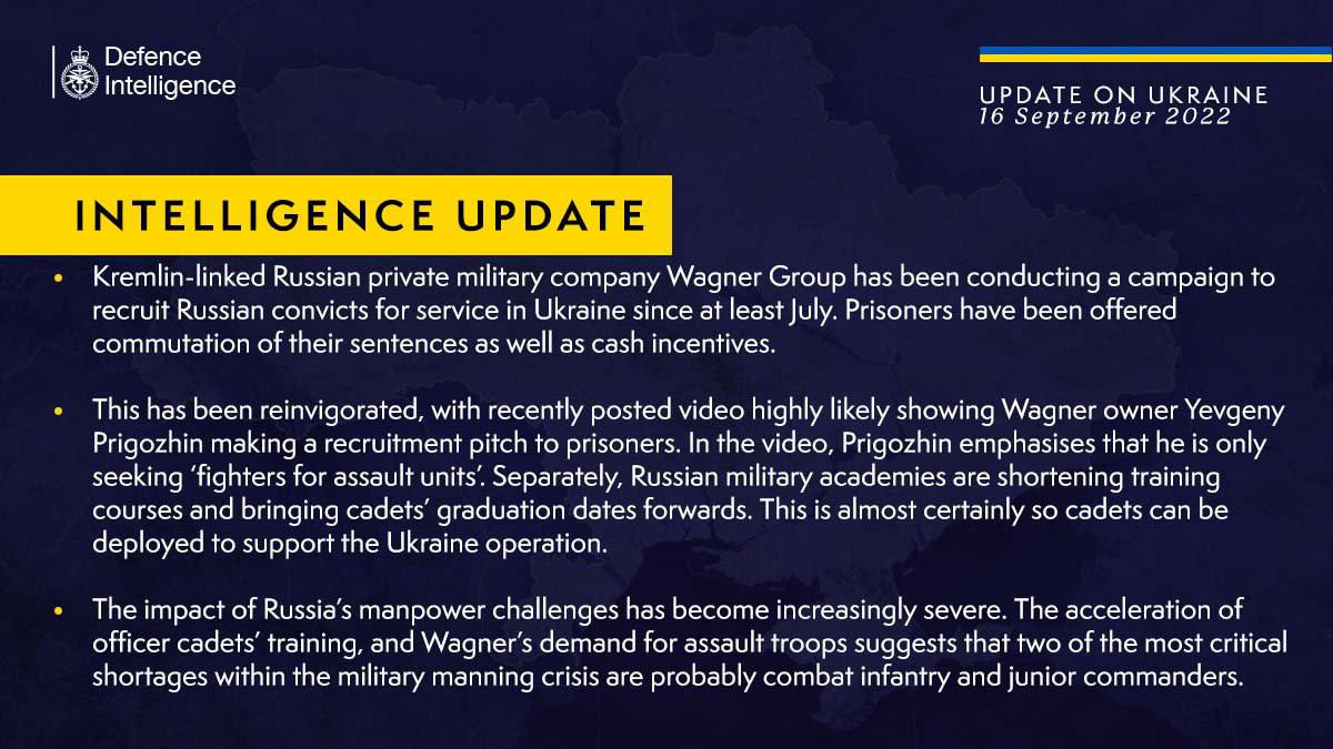 В минобороны Британии считают, что на кадровые проблемы указывает вербовка среди российских заключенных, которую проводит ЧВК "Вагнера", а также тот факт, что российские военные академии сокращают срок обучения курсантов. Разведка Британии полагает, что кадетов могут перебросить на войну в Украине.