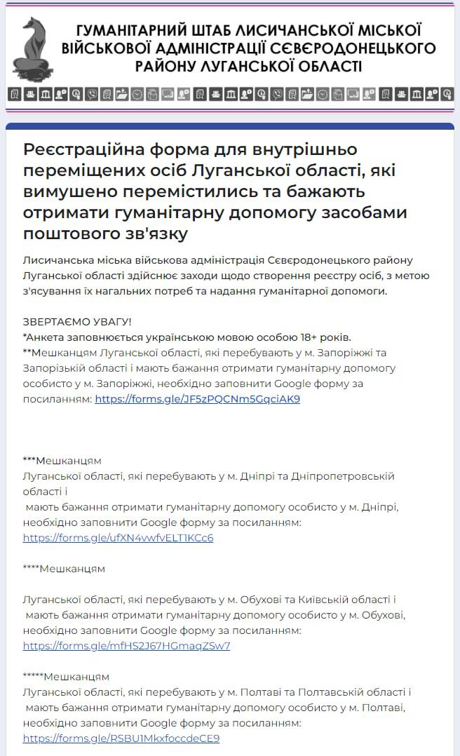 09:50 В Луганской ОВА показали, как заполнять формы для беженцев из области, которые находятся в штабах Запорожья, Полтавы, Днепра и Обухова, чтобы получить гуманитарную помощь лично, и через Укрпочту.