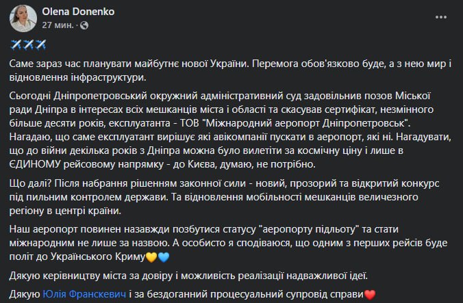 "Сегодня Днепропетровский окружной административный суд удовлетворил иск городского совета Днепра в интересах всех жителей города и области и отменил сертификат, неизменного более десяти лет, эксплуатанта ООО "Международный аэропорт Днепропетровск", - написала она.