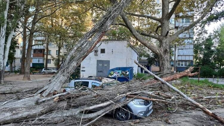 Вслед за мощным ураганом, который пронесся над Сумской областью, непогода пришла и в Николаев. В городе сильный ветер повалил дерево, которое упало на автомобиль.