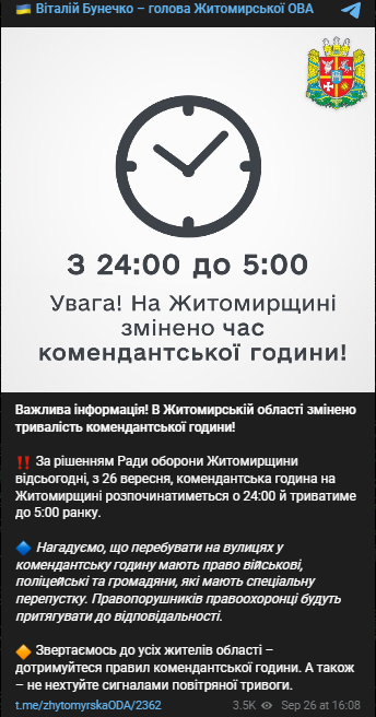"По решению Совета обороны Житомирской области с 26 сентября комендантский час в Житомирской области будет начинаться в 24:00 и длиться до 5:00 утра. Напоминаем, что находиться на улицах в комендантский час имеют право военные, полицейские и граждане, имеющие специальный пропуск. Правонарушителей правоохранители будут привлекать к ответственности. Обращаемся ко всем жителям области – соблюдайте правила комендантского часа. А также – не пренебрегайте сигналами воздушной тревоги", - написал Бунечко.