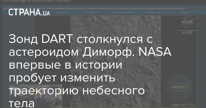 Столкновение зонда DART с астероидом, не представляющим опасности для Земли, состоялось в 19:15 по времени восточного побережья США (02:15 по киевскому времени 27 сентября). Зонд в момент столкновения двигался со скоростью около 24 тыс. км/ч.