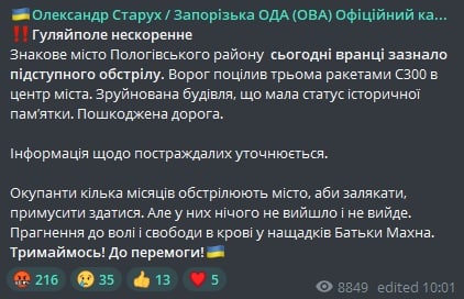 10.35 По центру прифронтового Гуляйполя ударили три ракеты С-300, сообщают в Запорожской ОГА.