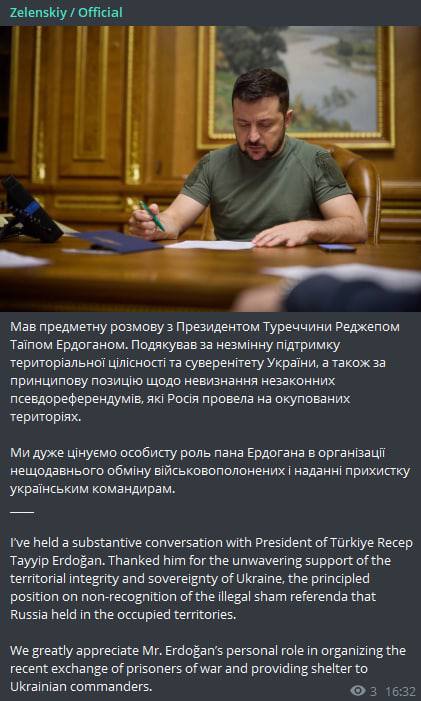 2. По итогам разговора с Эрдоганом сказал, что оставшиеся в Турции командиры "Азова" скоро смогут увидеться с родными. Также сообщил, что освобожденным из плена уже оказывается различная помощь.