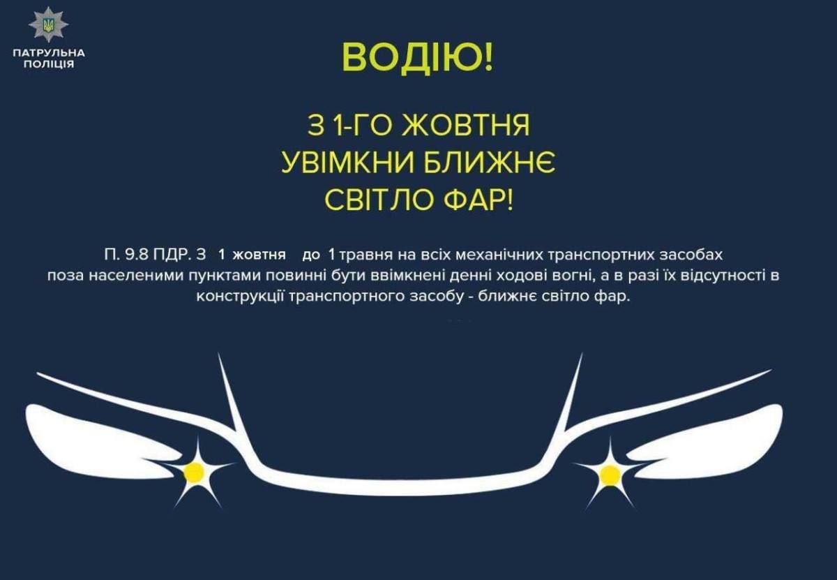 С сегодняшнего дня, 1 октября, водители в Украине обязаны включать дневной свет фар за городом в любое время суток. Это правило будет действовать до мая.