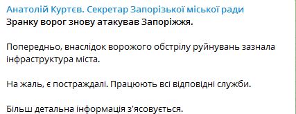 07.52 Стали известны подробности утреннего обстрела Запорожья.
