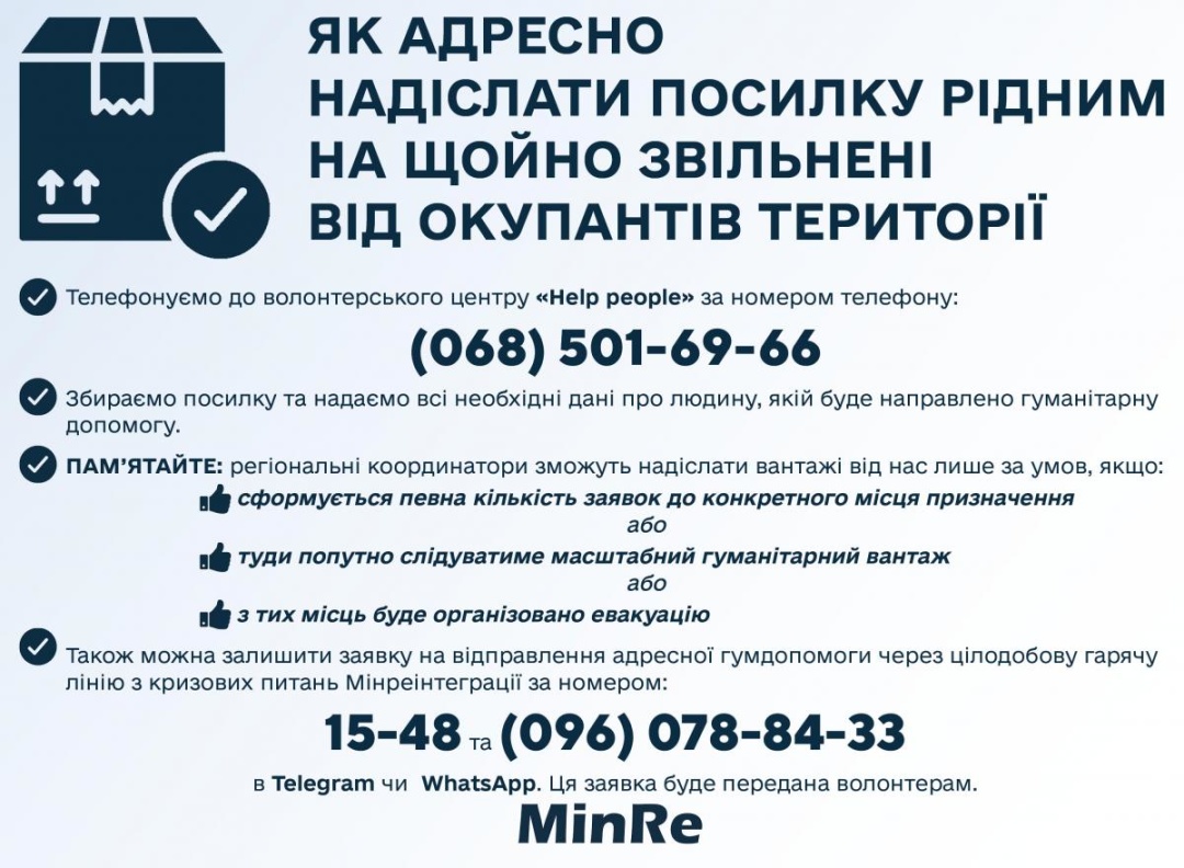 07.15 В Минреинтеграции обнародовали инструкцию, как отправить посылку на освобожденные территории своим родным.
