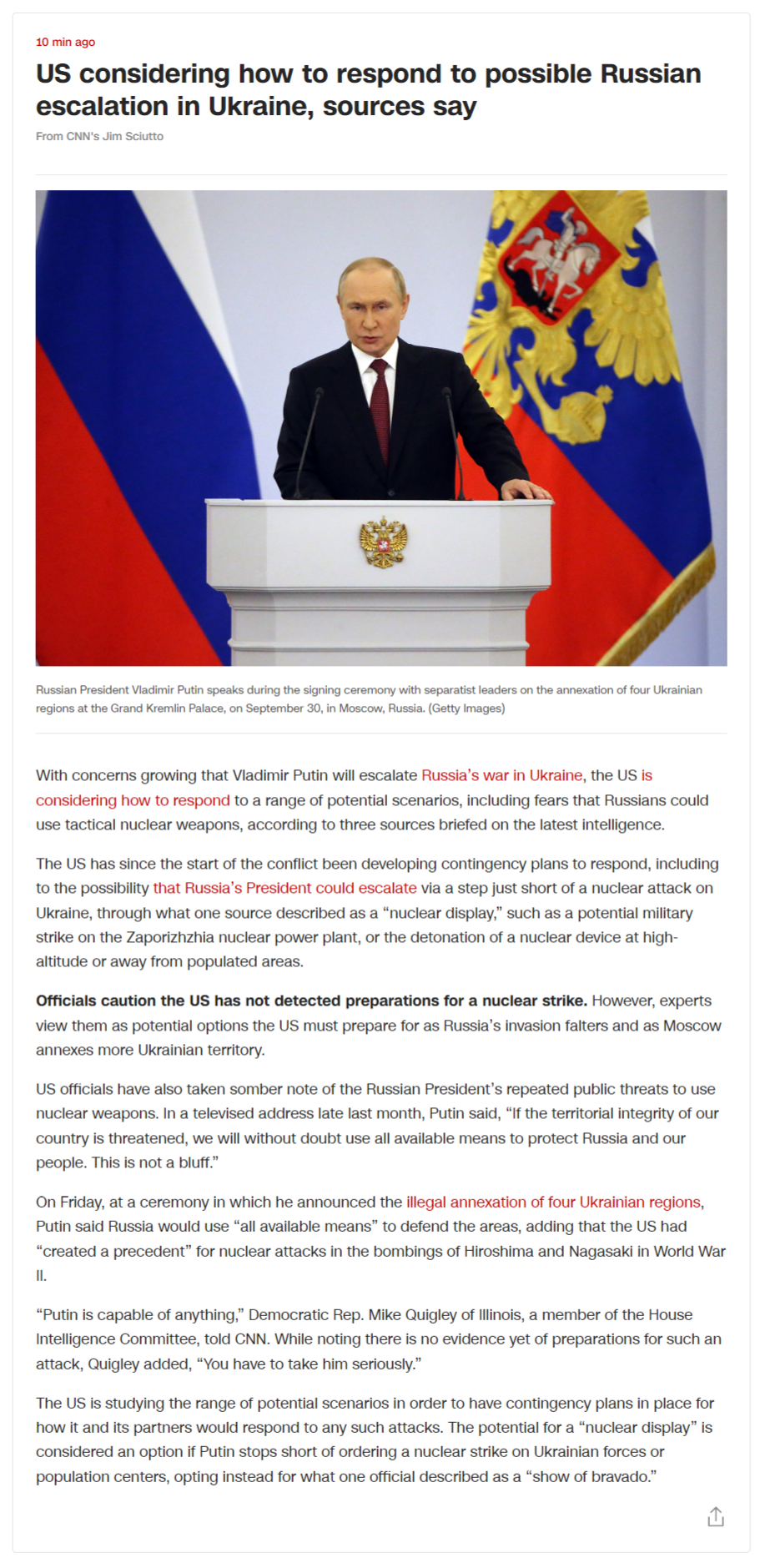 По его словам, использование Россией ядерного оружия в Украине не приведет к срабатыванию статьи 5 НАТО о коллективной обороне, т.к. Украина не член альянса, однако "ответ США и НАТО", по его мнению был бы уместен.