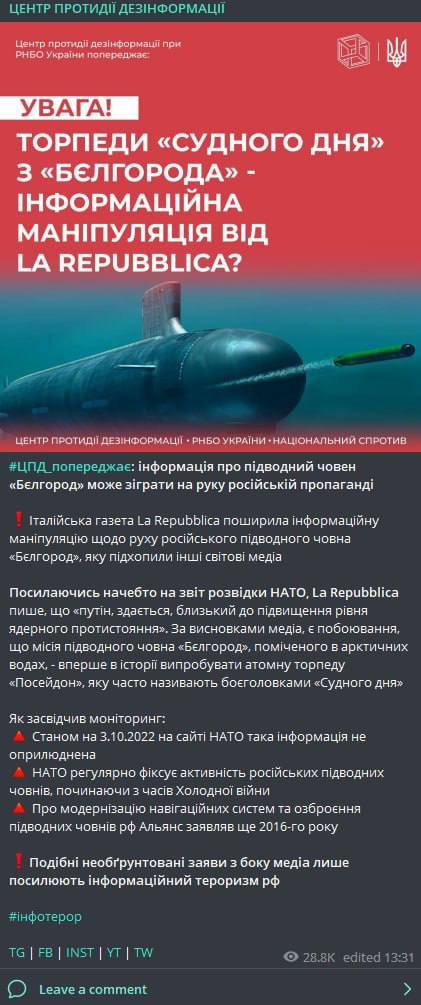 09.05 В НАТО предупредили страны альянса о выходе с базы ВМФ РФ подводной лодки "Белгород", которая несёт ядерные торпеды "Посейдон".