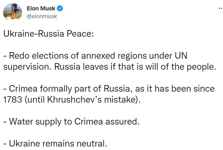 – провести выборы в регионах, присоединенных РФ выборы под наблюдением ООН. "Россия уходит, если на то будет воля народа", – пишет Маск.