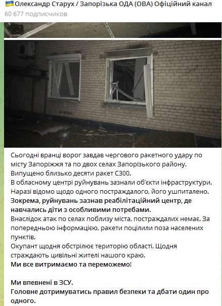 Было выпущено около десяти ракет С300. В Запорожье разрушениям подверглись объекты инфраструктуры. В частности, реабилитационный центр, где учились дети с особыми потребностями. Пока известно об одном пострадавшем, он госпитализирован.