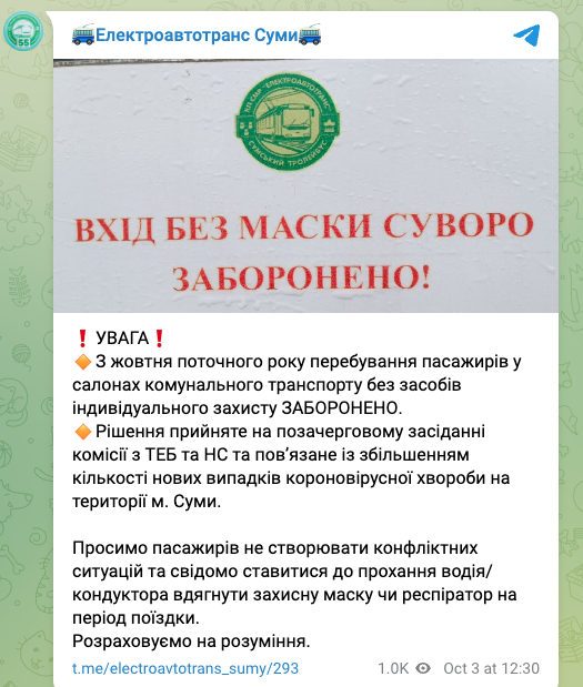 "С октября текущего года нахождение пассажиров в салонах коммунального транспорта без средств индивидуальной защиты запрещено", - говорится в сообщении.