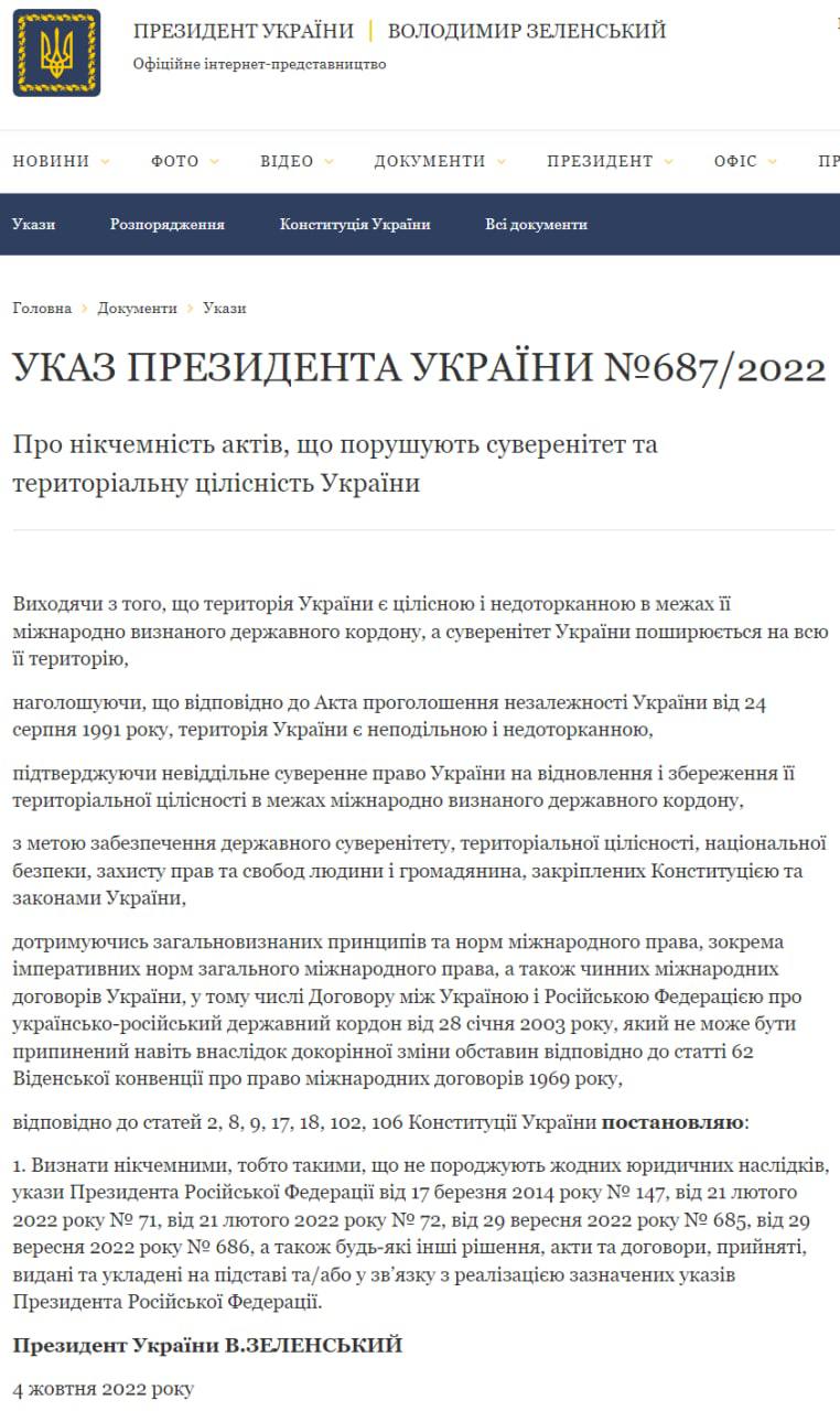Президент Владимир Зеленский своим указом ввел в действие решение Совета национальной безопасности и обороны от 30 сентября о действиях Украины в ответ на попытку России аннексировать территории Украины, которым констатируется невозможность проведения переговоров с президентом России Владимиром Путиным.