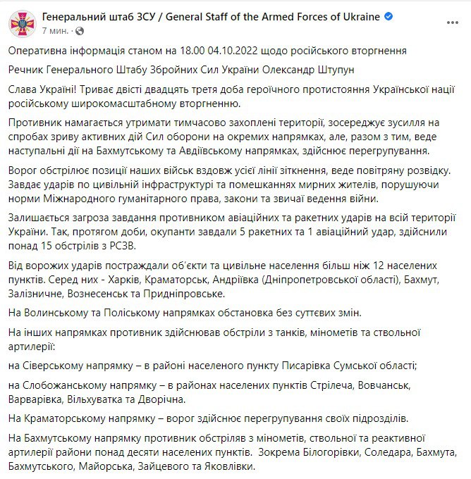 07:09 Сводка Генштаба ВСУ на утро 4 октября.