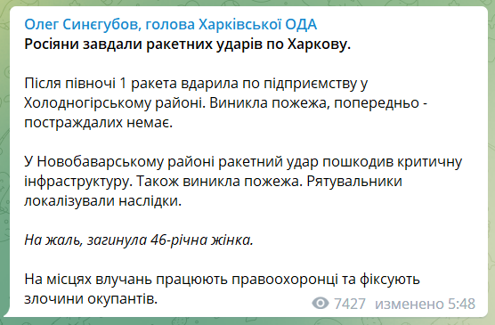 По его словам, в Холодногорском районе города после полуночи одна ракета попала по предприятию. Произошел пожар. По предварительным данным, обошлось без пострадавших.