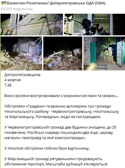 07.40 Ночью в Днепропетровской области россияне обстреляли "Градами" и тяжелой артиллерией Никопольский район.