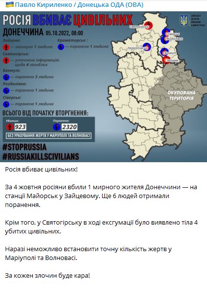 08.05 За минувшие сутки 4 октября в Донецкой области от действий РФ погиб один мирный житель на станции Майорск в Зайцево. Еще 6 человек получили ранения.