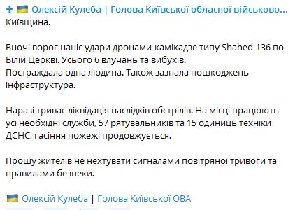 "Есть информация о нескольких взрывах в Белой Церкви. По предварительным данным, город атакован дронами-камикадзе. Из-за этого – пожары на объектах инфраструктуры. Есть один пострадавший" - написал он.