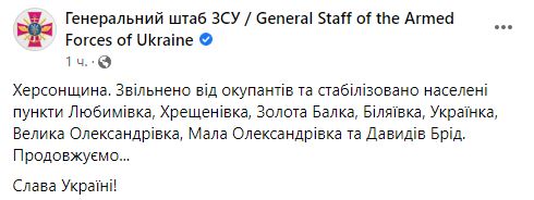 "Херсон. Освобождены от оккупантов и стабилизированы населенные пункты Любимовка, Крещеновка, Золотая Балка, Беляевка, Украинка, Большая Александровка, Малая Александровка и Давыдов Брод" - перечислили в Генштабе ВСУ.