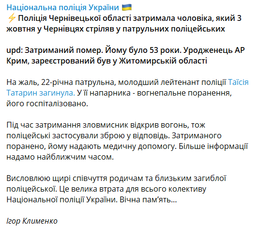 Мужчина, убивший вечером 4 октября 22-летнюю полицейскую в Черновцах, умер при задержании. Он открыл огонь и правоохранители в ответ также применили оружие.