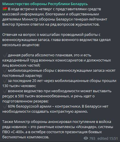При необходимости Минобороны Беларуси может призвать на военную службу 500 тысяч военнообязанных, заявил министр обороны Беларуси Виктор Хренин.