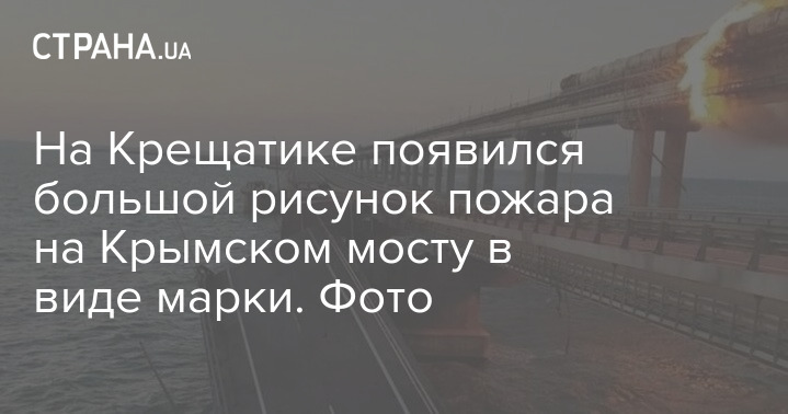 На Крещатике появился большой рисунок пожара на Крымском мосту в виде марки. Фото