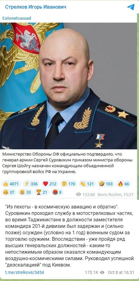 Также Стрелков заявил, что Суровикин командовал отступлением российской армии под Киевом.