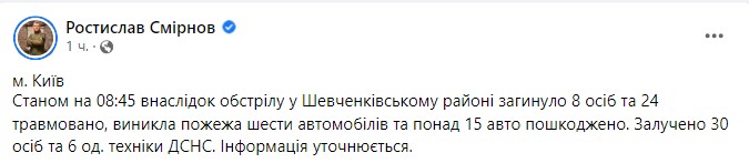 В Шевченковском районе Киева в результате ракетного удара погибли восемь человек, еще 24 мирных жителя получили ранения.