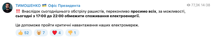 Такие меры помогут пройти критические нагрузки украинских электросетей. Фото: t.me/tymoshenko_kyrylo
