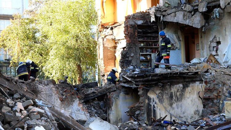 Спасатели разбирают завалы дома, в который попала ракета РФ. Фото ГСЧС