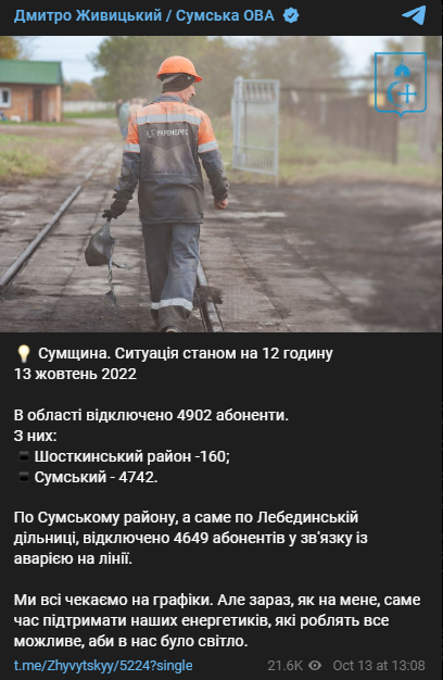 В Сумской области 13 октября без света остались тысячи абонентов. В настоящее время продолжаются работы по возобновлению электроснабжения.