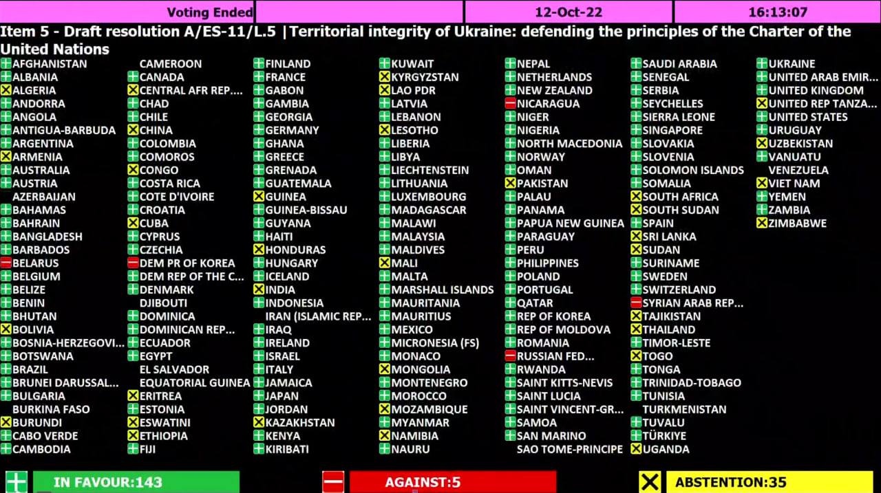 Вчера ООН приняла резолюцию с критикой действий России. В документе говорится, что государства осудили организацию "референдумов" и аннексию украинских территорий. И признают лишь границы Украины по состоянию на 1991 год.