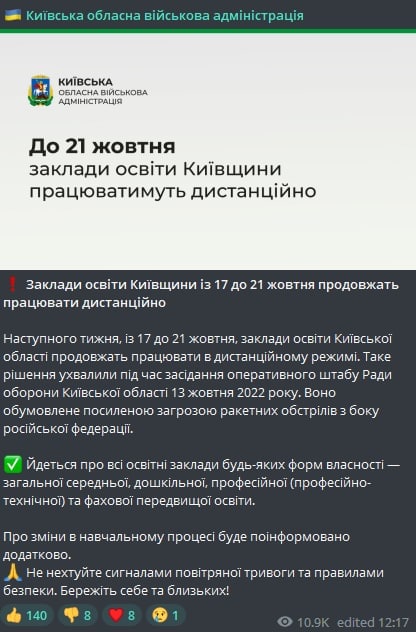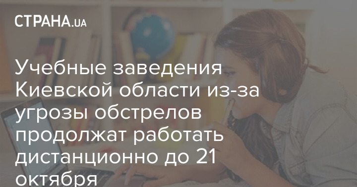 Все учебные заведения Киевской области продолжат работать дистанционно до 21 октября из-за угрозы ракетных обстрелов. Об этом сообщили в Киевской областной военной администрации.