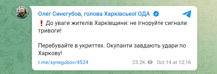 Глава Харьковской ОВА Олег Синегубов призывает жителей не игнорировать сигналы воздушной тревоги и находиться в укрытиях.