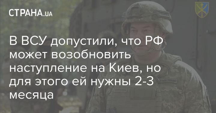 Командующий Объединенными силами ВСУ генерал-лейтенант Сергей Наев считает, что российская армия может возобновить наступление на Киев. Но для того, чтобы его организовать, понадобится не менее двух-трех месяцев.