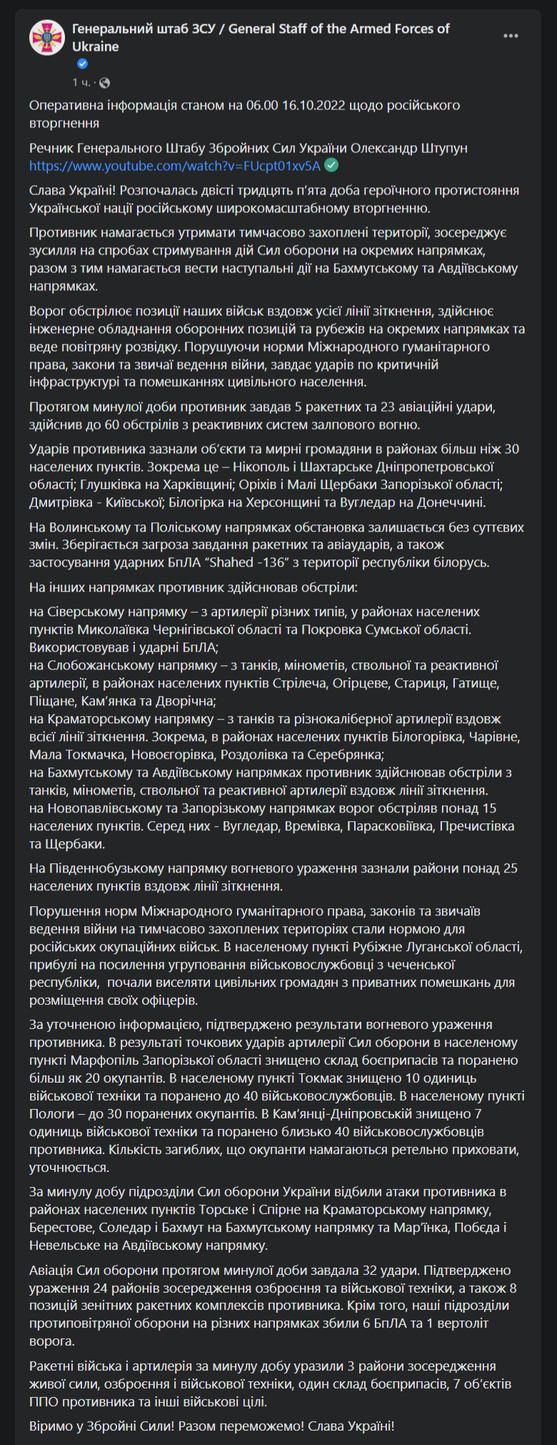 Сводка Генштаба ВСУ по состоянию на 18:00 16 октября 2022 года