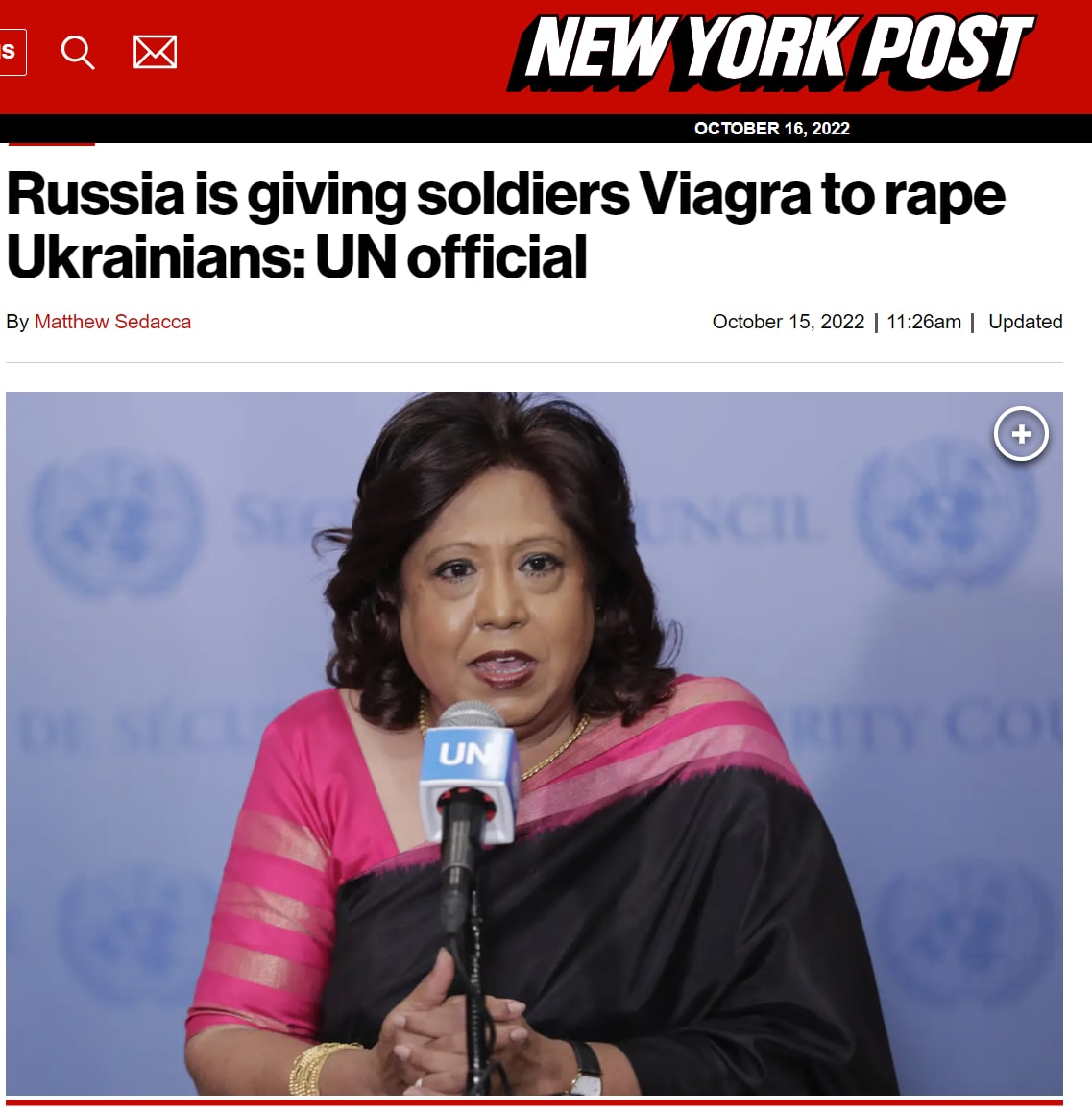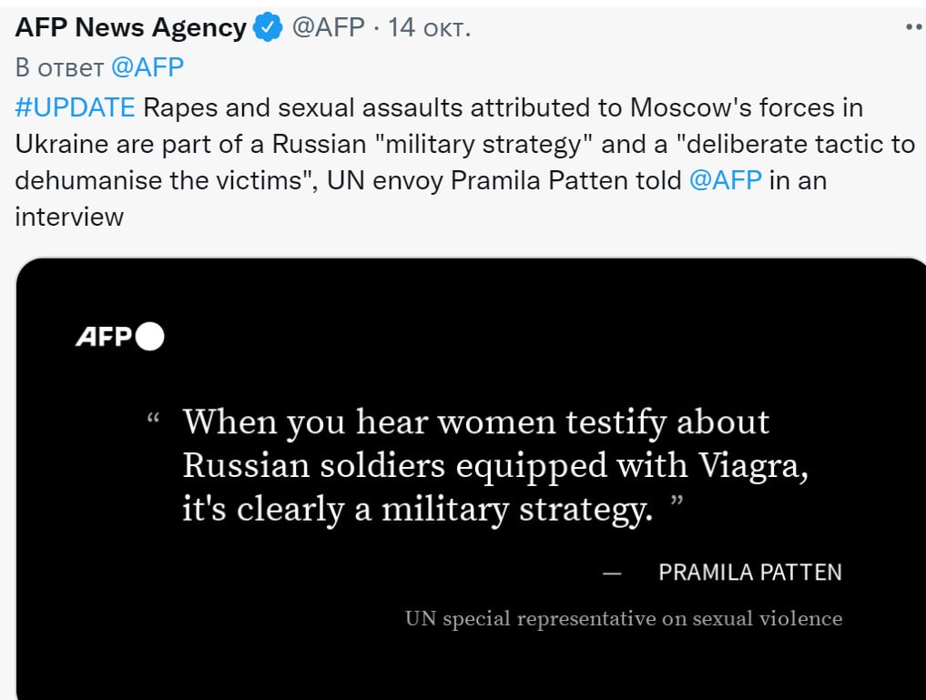 "Когда вы слышите, как женщины дают показания о российских солдатах, вооруженных виагрой, здесь явно видится военная стратегия", - сообщила чиновница.