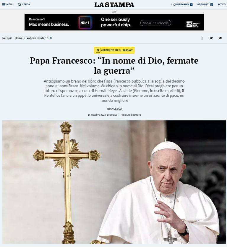 Особое внимание в книге папа Франциск уделил проблеме войны в современном мире, которую он охарактеризовал как "провал политики".