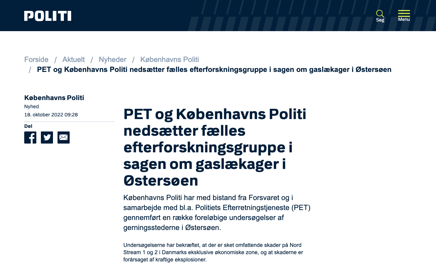 "Расследование подтвердило, что на газопроводах "Северный поток - 1" и "Северный поток - 2" в исключительной экономической зоне Дании произошли масштабные повреждения и что они вызваны сильными взрывами", — говорится в пресс-релизе.