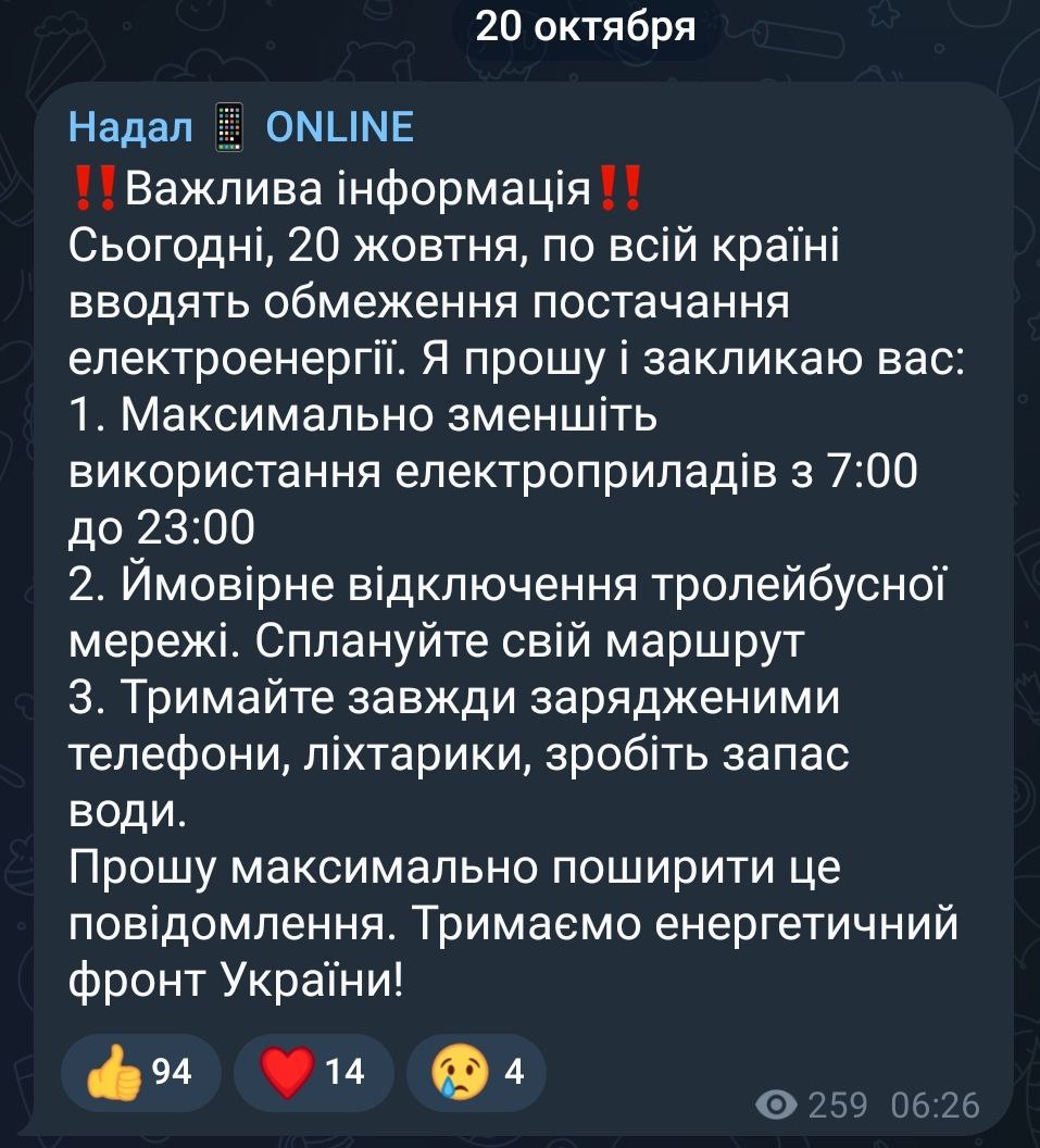 20.45 В Киевской областной военной администрации призывают к тотальной экономии света и завтра.