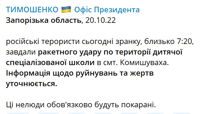 08:37 В Камышевахе Запорожской области сегодня утром был ракетный удар по территории детской спецшколы, сообщил замглавы ОП Кирилл Тимошенко.